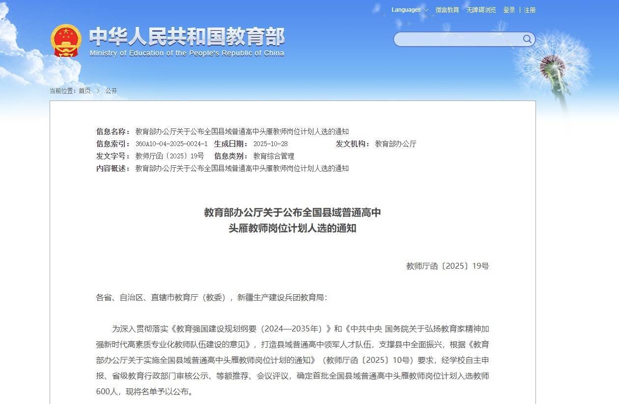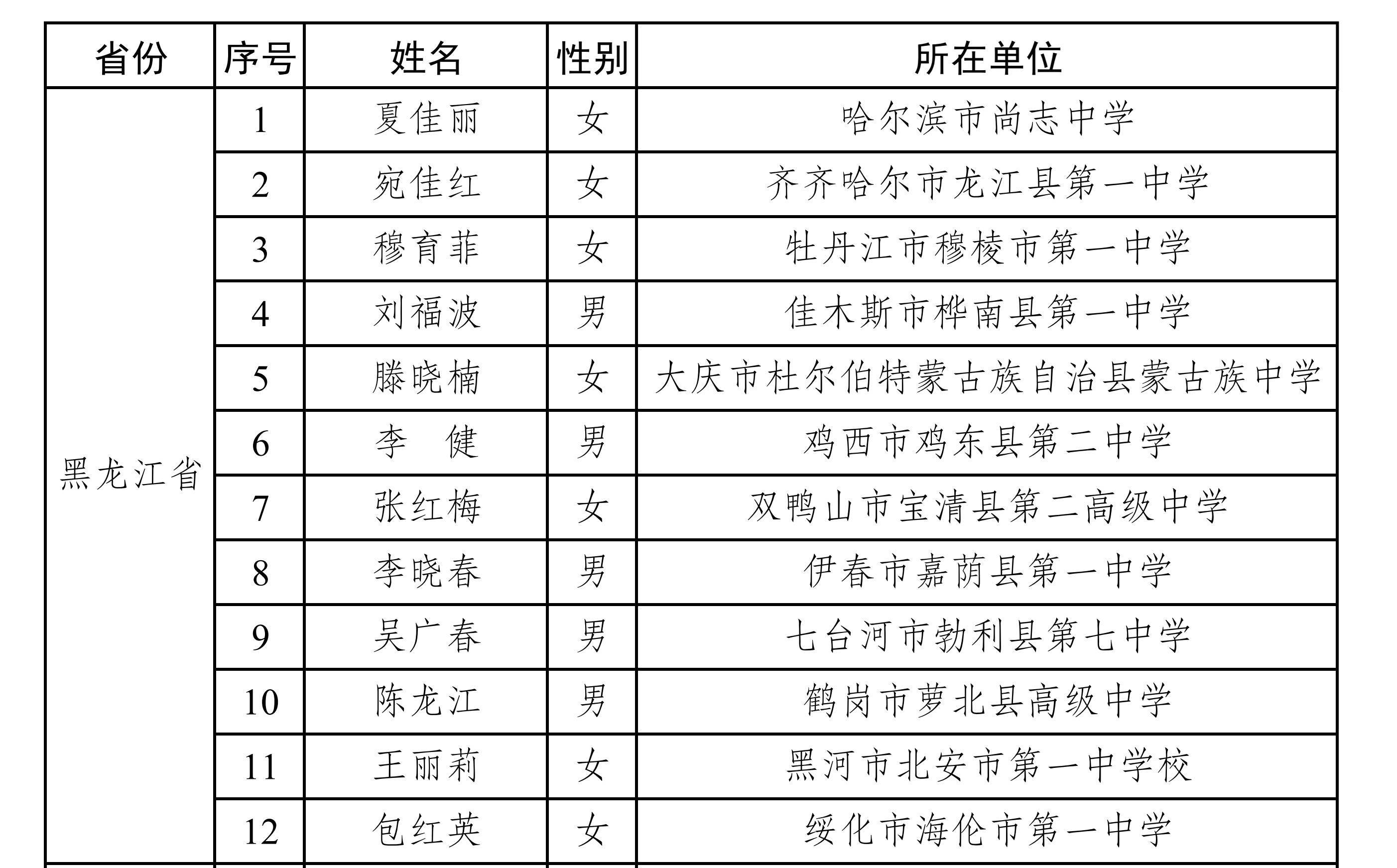 近日,教育部网站公布全国县域普通高中头雁教师岗位计划人选名单。经学校自主申报、省级教育行政部门审核公示、等额推荐、会议评议,确定首批全国县域普通高中头雁教师岗位计划入选教师600人。其中,黑龙江12人入选。